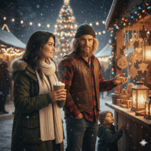 Je näher ich dem Platz des Festivals komme, desto voller wird es. Kinder laufen lachend an mir vorbei, ihre Eltern rufen sie dazu auf, zu warten. Aufregung liegt in der Luft. Es duftet nach Zimt, Cider und warmem Kakao, den man auch dringend braucht, wenn man sich länger draußen aufhält. Schneeflocken glitzern auf den Mützen und Mänteln. Der Weihnachtsbaum schimmert, die Hütten erstrahlen in Lichterketten.