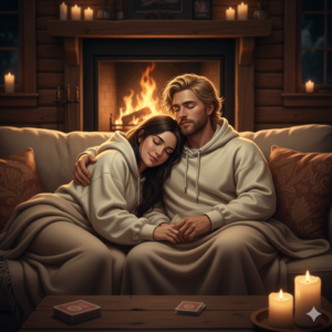 Tucker legt am Abend noch Holz nach und wir haben uns den ganzen Tag kaum bewegt. Außer in die Küche, um alle seine Vorräte zu plündern, und dann habe ich ihm wieder beim Kochen zugeschaut. Jetzt setzt er sich wieder zu mir auf das Sofa und ich lehne meinen Kopf an seine Schulter.